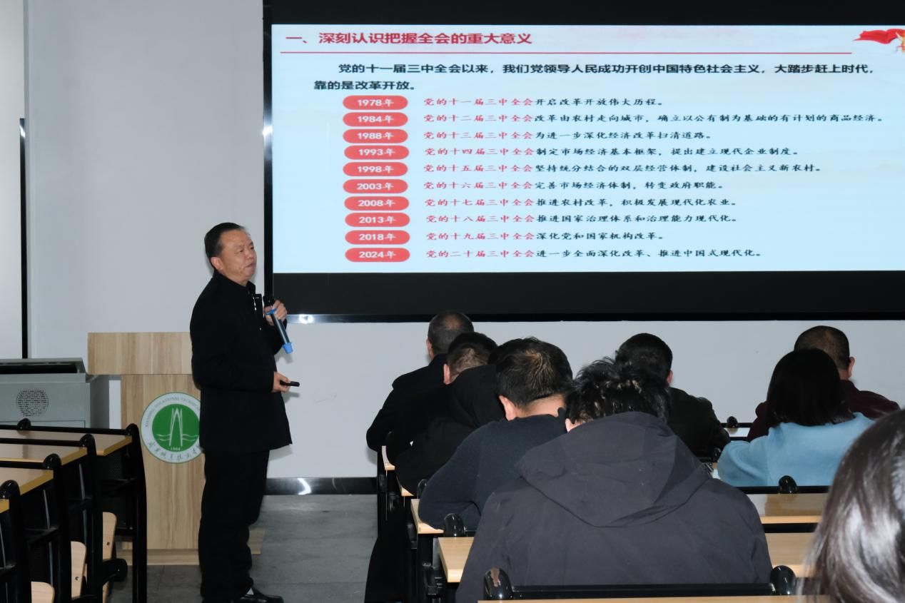 吴高岭从党的二十届三中全会的重大意义、深入学习领会习近平总书记在全会上的重要讲话精神、全面准确理解和把握《决定》提出的进一步全面深化改革的重大举措以及凝聚共识、加压奋进,全力以赴抓好全会精神在学校落地落实等方面,进行了系统的阐释和全面解读。