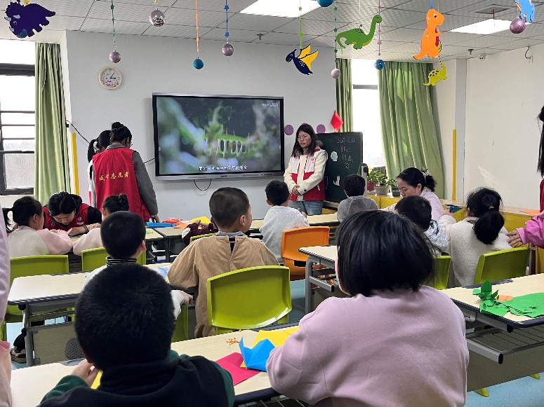 课程结束后,志愿者们陪伴孩子们开始了欢乐的互动时光。五颜六色的气球在志愿者们的手中变成各种有趣造型,孩子们兴奋地拍打着气球,欢笑声此起彼伏。与此同时,志愿者们还拿出彩色卡纸,手把手地教孩子们折纸,将一张张普通的彩纸变成千纸鹤、小青蛙、小飞机。孩子们兴致勃勃地参与其中,在志愿者们的鼓励和帮助下,努力完成自己的作品,脸上洋溢着自豪与喜悦。