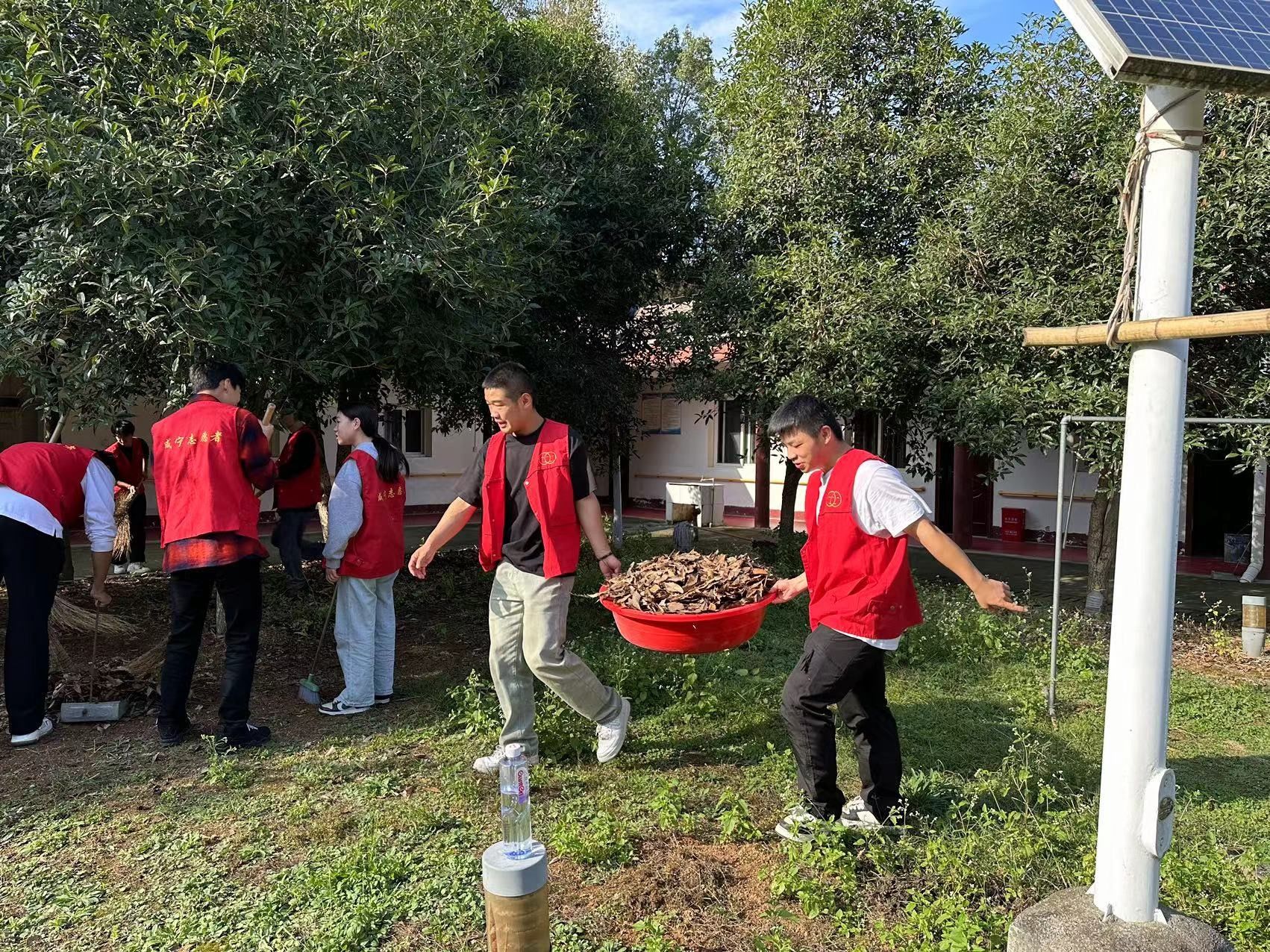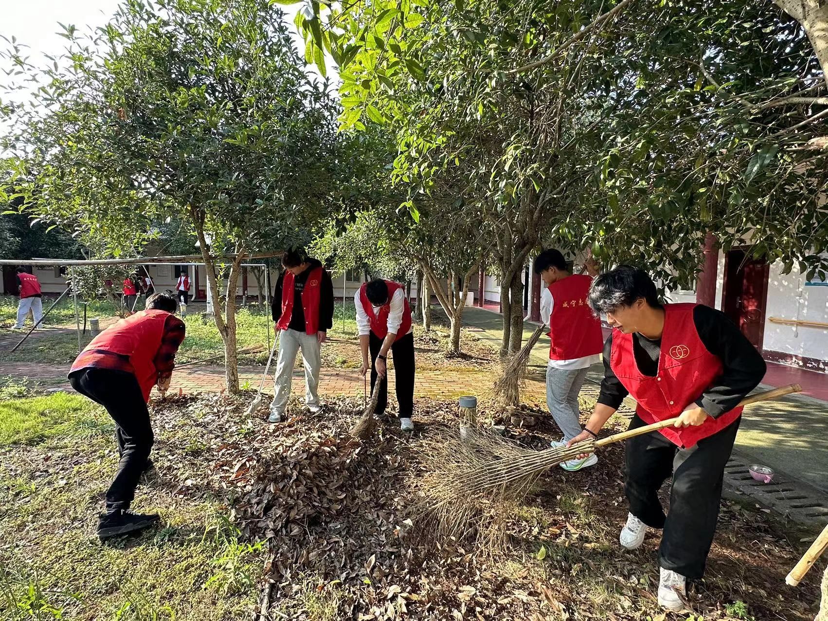 同学们自带清扫工具,身穿整齐红马甲,步行前往浮山敬老院。到达敬老院后,在黄院长的安排下,同学们拿起清扫工具清扫枯枝落叶。同学们分工协作,很快就将枯枝落叶清扫干净,敬老院环境面貌焕然一新。