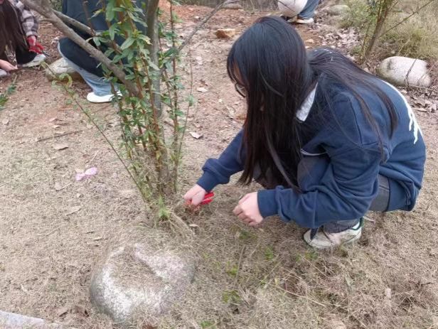 社团负责人孟心悦将志愿者分为若干个小组,每组3-5人。有的负责修剪石榴树上的枯枝和基部分蘖,有的负责挖穴,有的负责施肥,有的负责浇水。男生志愿者主动挖穴、浇水,女志愿者负责施肥,除草。大家分工协作,在劳动中体验团队协作的力量,在劳动中锻炼技能技术,很快完成了任务。