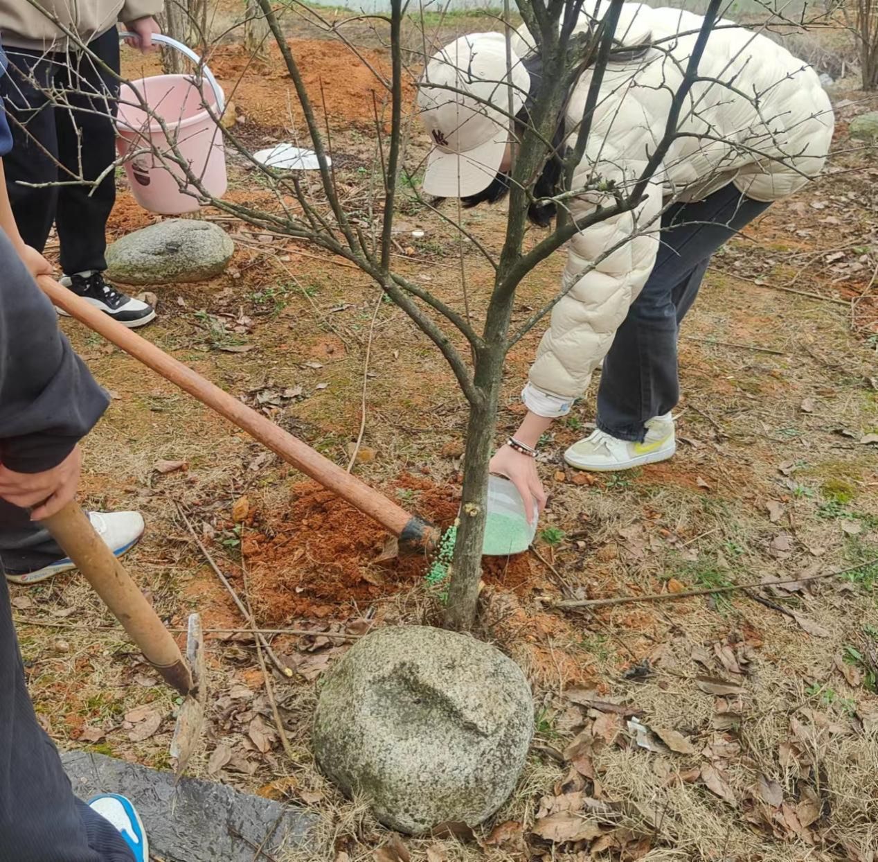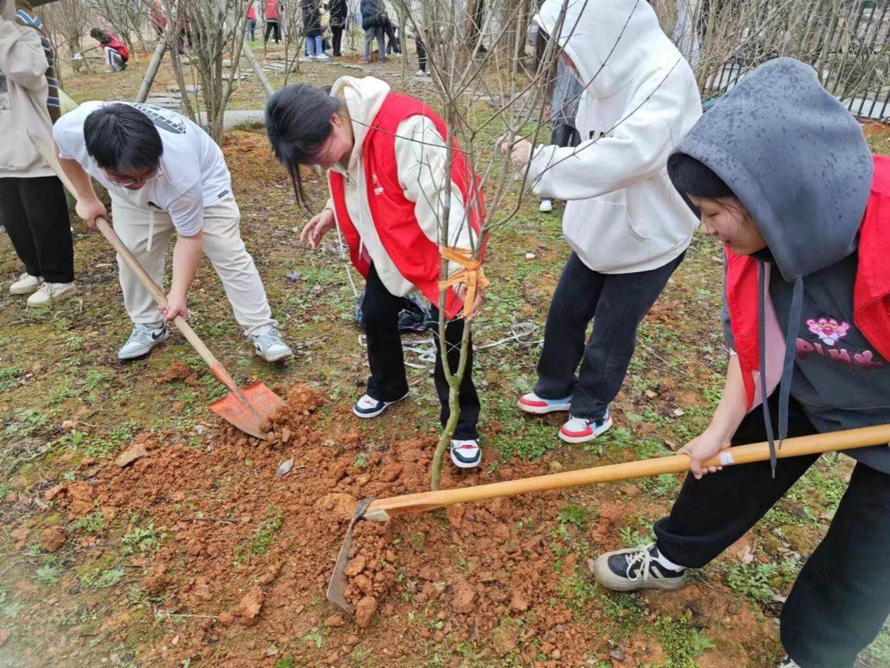 “七彩树”嫁接社团社长孟心悦将志愿者分为四个小组:植树组、修剪组、施肥组和后勤组,每组8-10人。志愿者分工协作,井井有条,热火朝天地忙碌起来:抡锄挖坑,挥锹培土,提剪修枝,挖坑施肥;志愿者脚上、裤腿上都沾满了泥巴,但劳动的快乐洋溢在脸上。看着亲手种植的小树,很多志愿者激动地拍照留念。