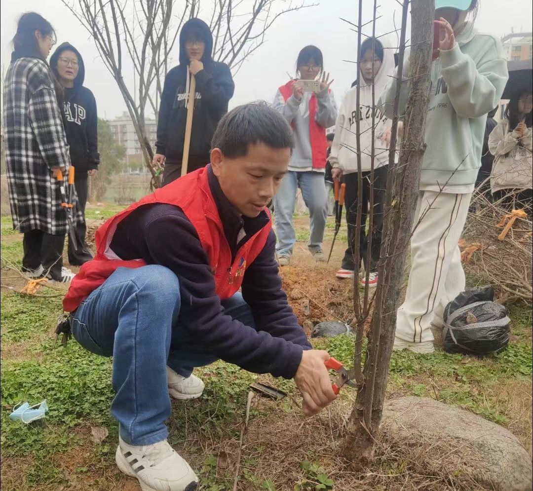指导老师徐群刚讲解“三埋两踩一提苗”的植树技巧,强调苗木要扶正,覆土要踩严实,苗木土球与地面平齐,不能种植太深,防止蹲苗,定植后要浇透水;修剪萌蘖枝条要从基部剪除,防止再次萌发无效枝条,减少养分损耗。