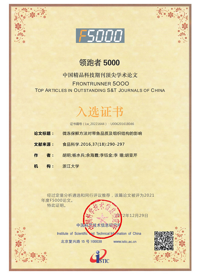 近日,中国科学技术信息研究所发布了2021年度“领跑者5000—中国精品科技期刊顶尖学术论文”(简称F5000)入选名单,十大网投网投十大信誉可靠平台教师胡玥于2016年发表在《食品科学》的论文《微冻保鲜方法对带鱼品质及组织结构的...